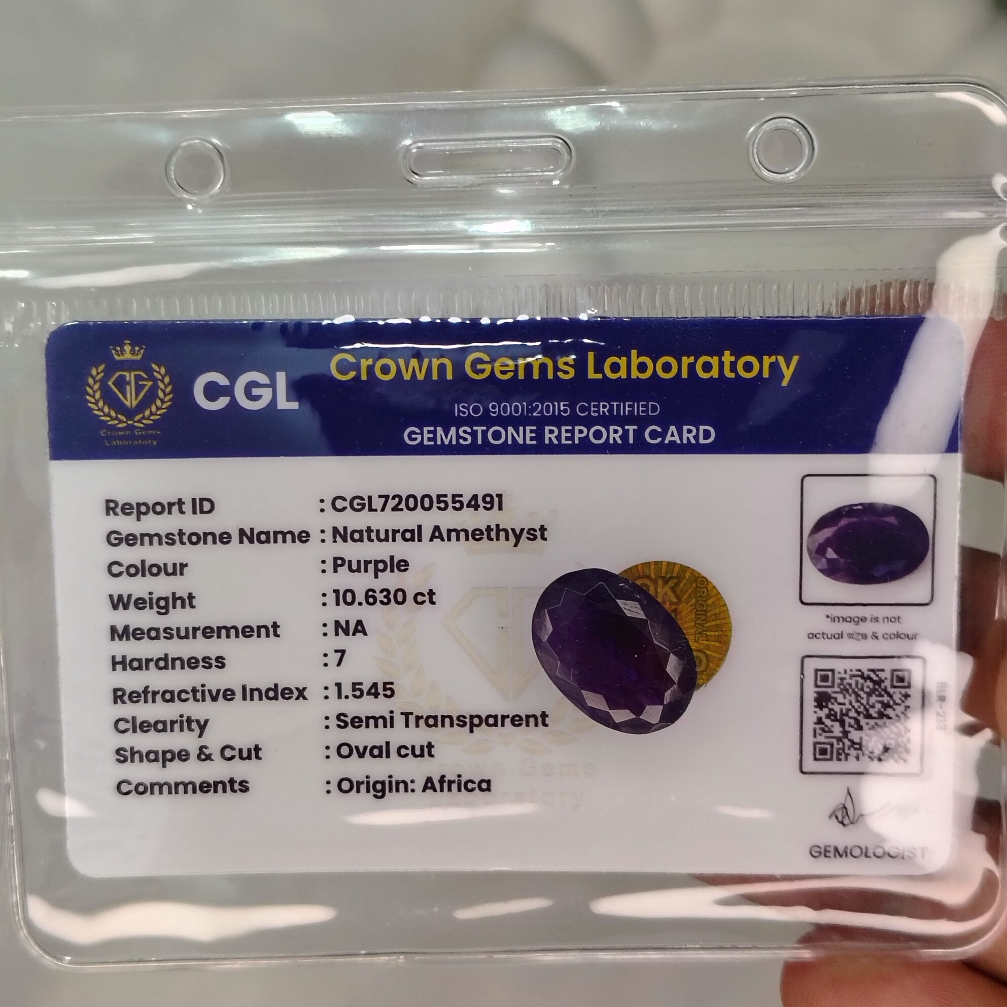 Discover the elegant beauty and calming energy of Natural Amethyst, admired for its spiritual significance and refined brilliance. This 10.630-carat gemstone is carefully selected for its excellent transparency, high lustre, and completely natural, untreated quality.