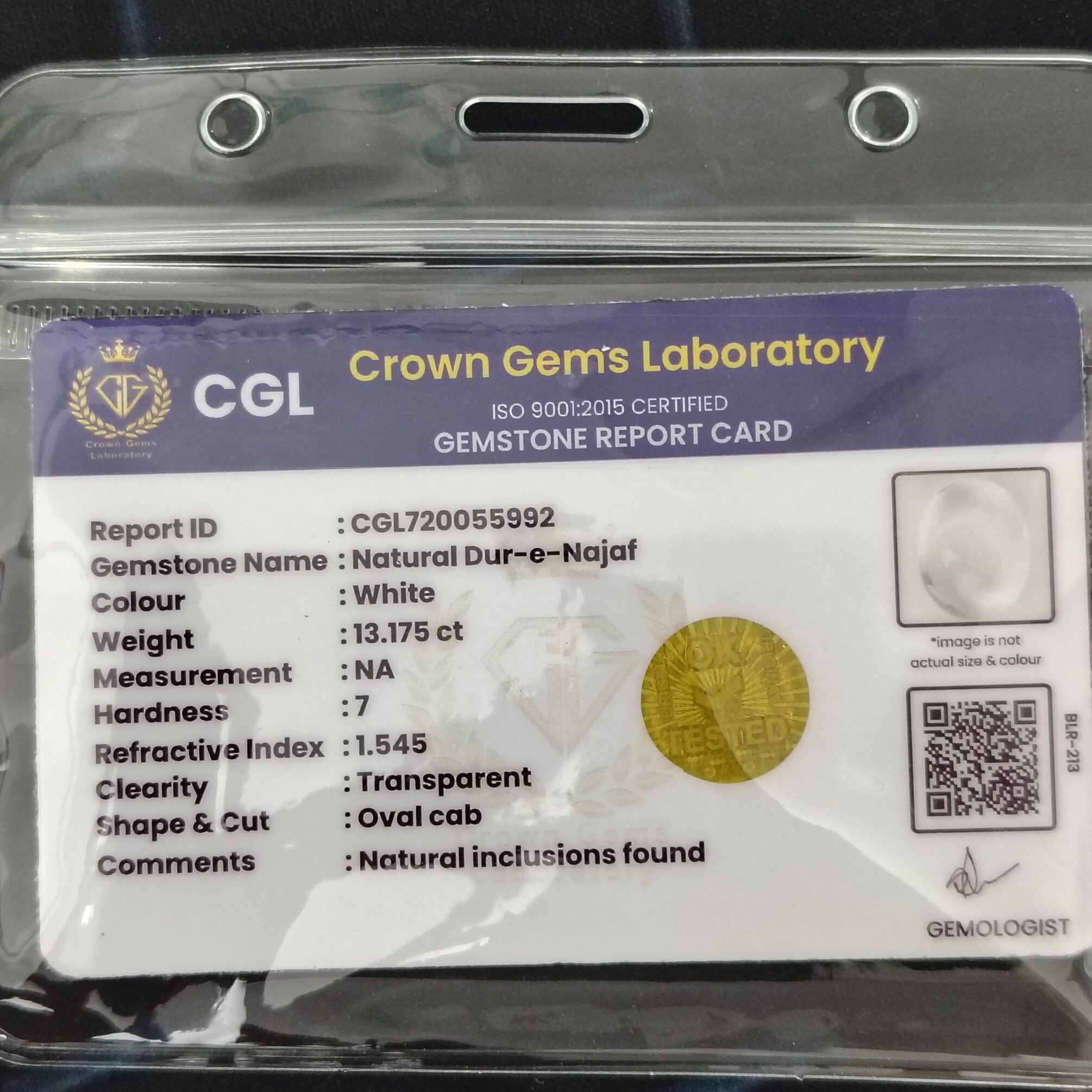 This 13.175 carats Natural Dur-e-Najaf is a genuine, transparent crystal quartz gemstone admired for its purity, clarity, and spiritual significance. The gemstone is 100% natural and untreated, carefully selected to ensure excellent brilliance and quality. Ideal for rings, pendants, and spiritual jewelry, it is supplied with a certificate of authenticity, guaranteeing originality and trust.