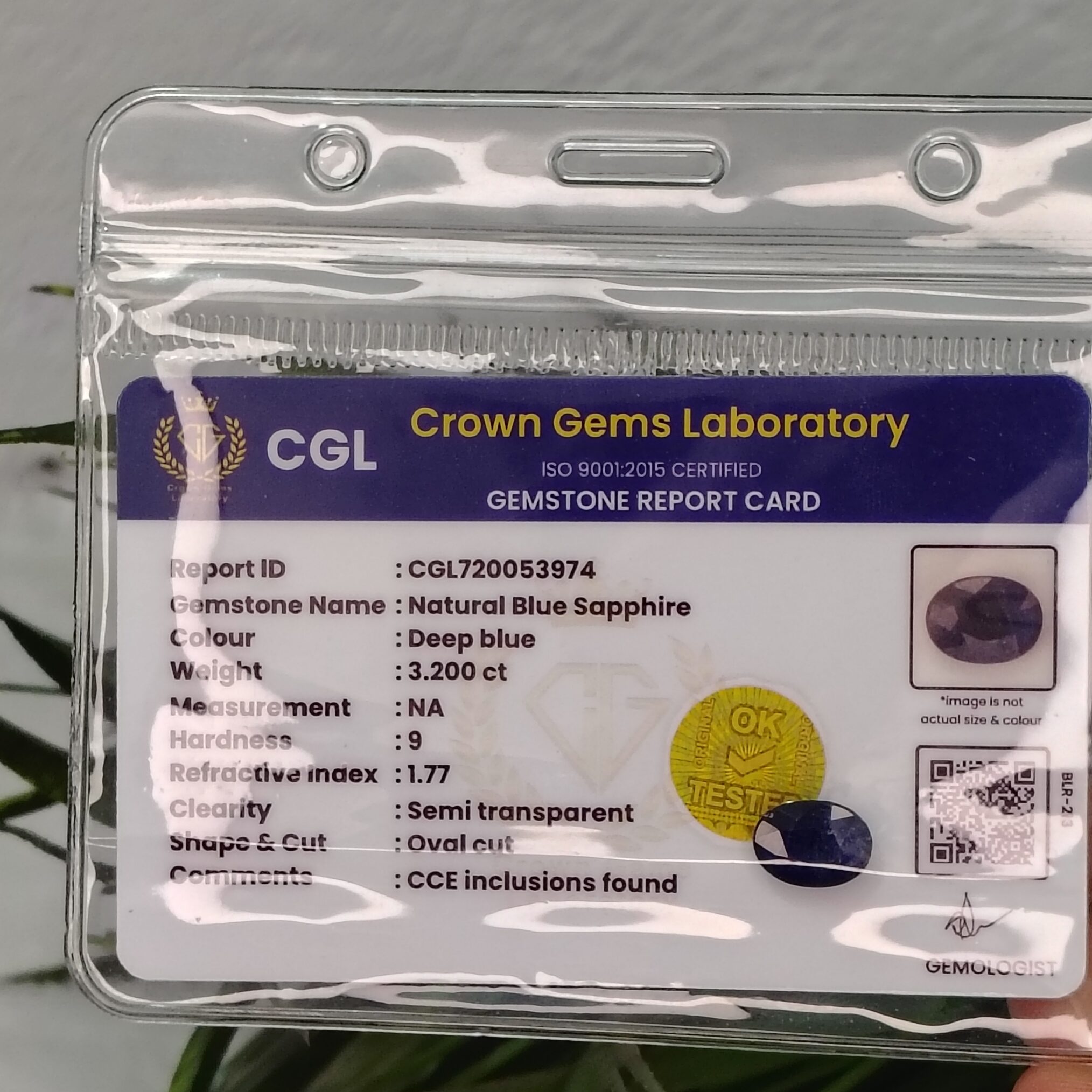 This 3.200 carats Natural Blue Sapphire (Neelam) is a stunning gemstone known for its deep blue color, high brilliance, and strong astrological significance. Carefully selected for quality and authenticity, this sapphire is 100% natural and lab certified, making it ideal for both fine jewelry and astrological purposes.