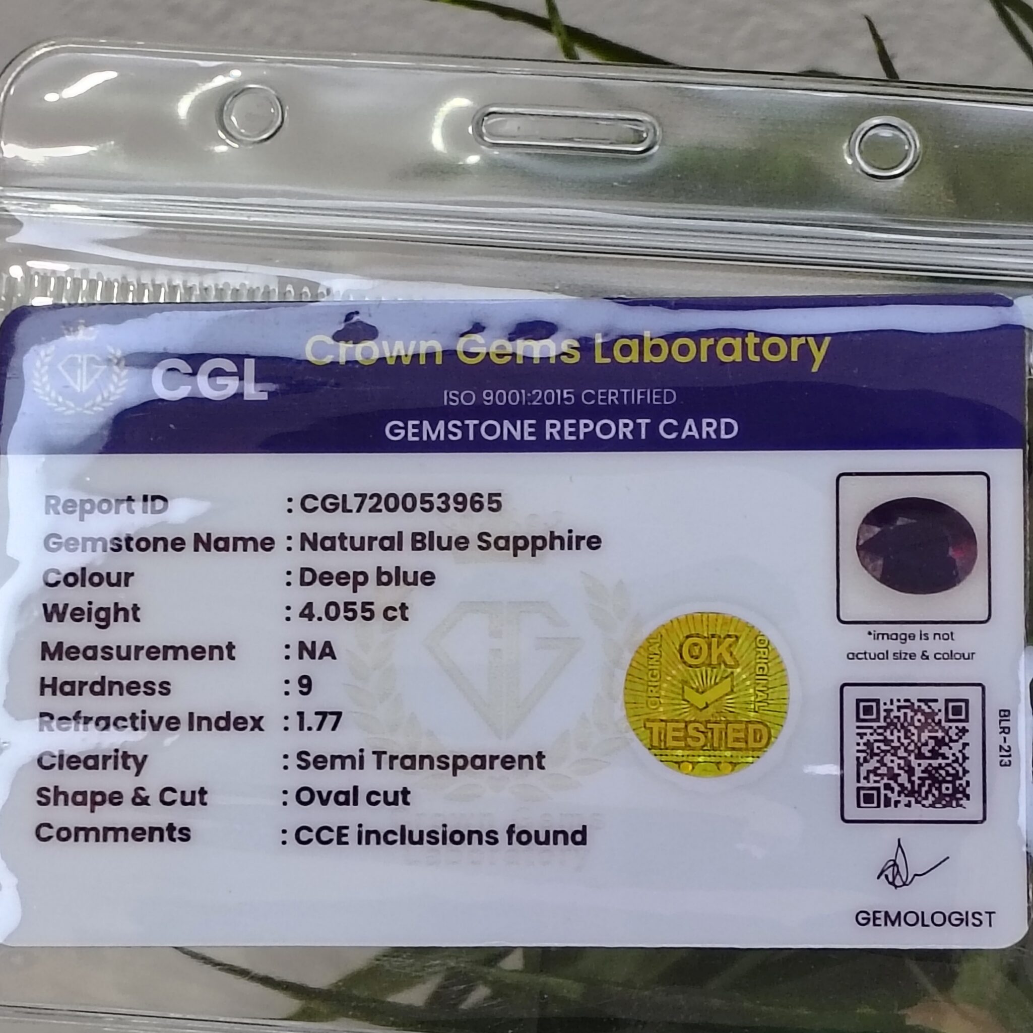 This 4.055 carats Natural Blue Sapphire (Neelam) displays a rich, deep blue hue with excellent brilliance and clarity. Carefully selected for authenticity and quality, this gemstone is 100% natural and lab certified, making it ideal for fine jewelry as well as astrological use.