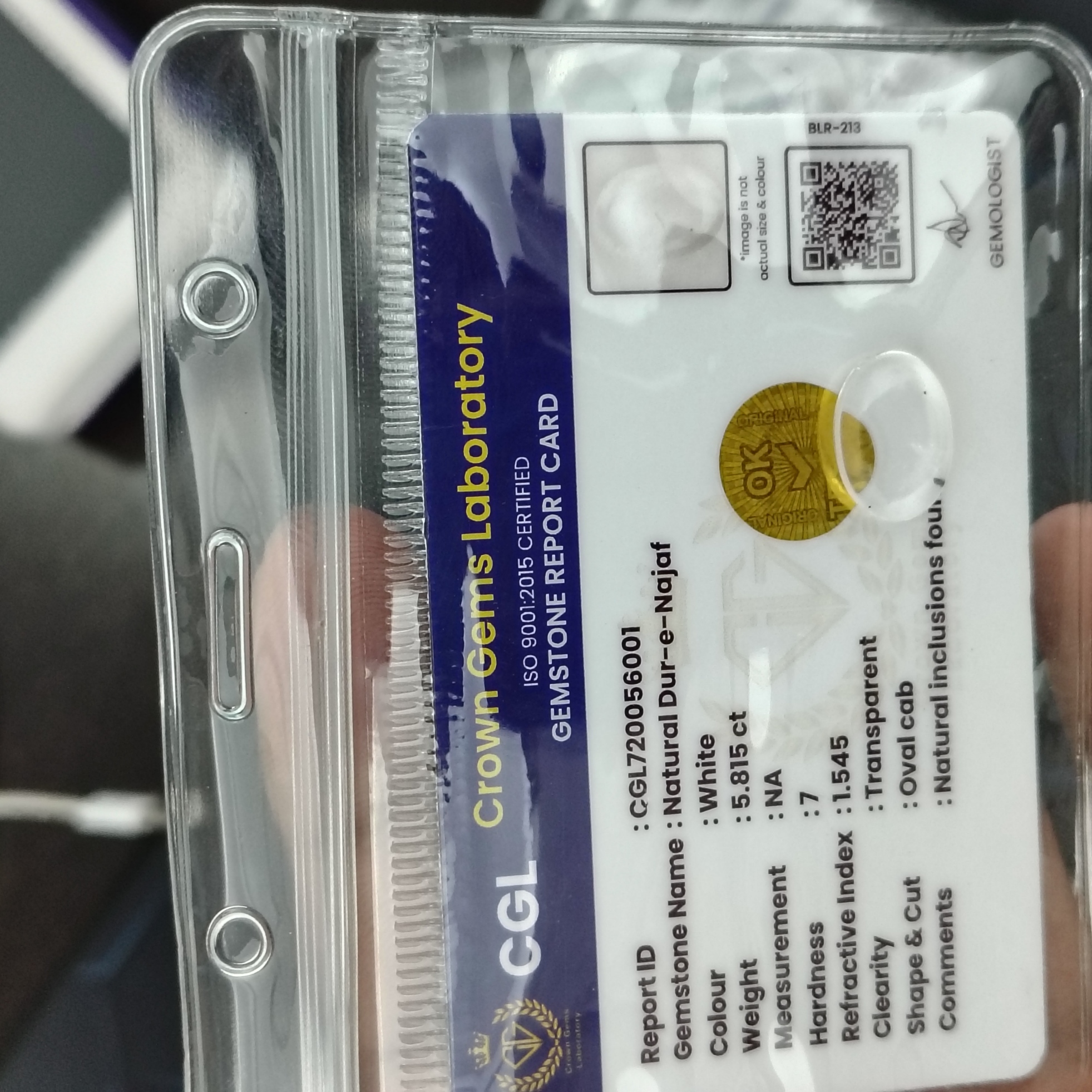 This 5.815 carats Natural Dur-e-Najaf is a genuine, transparent crystal quartz gemstone valued for its purity, clarity, and spiritual significance. The gemstone is 100% natural and untreated, carefully selected to ensure excellent brilliance and quality. Ideal for rings, pendants, and spiritual jewelry, it is supplied with a certificate of authenticity, guaranteeing originality and trust.