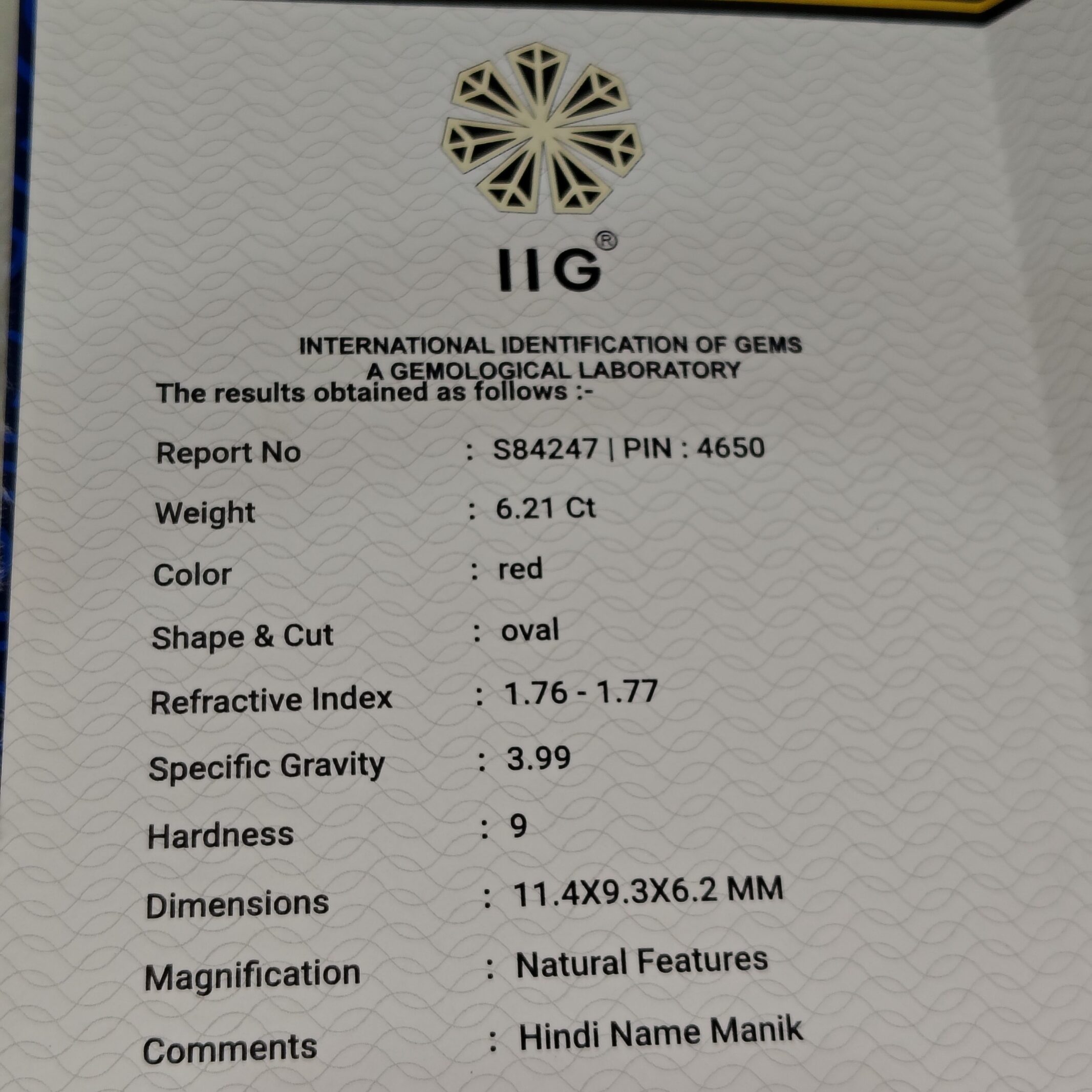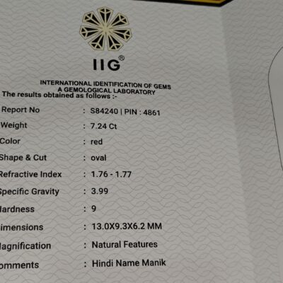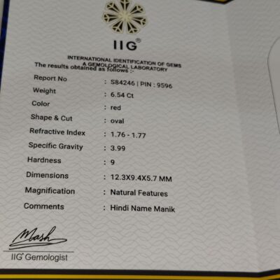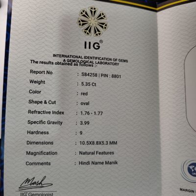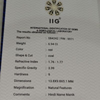 This 6.21 Carat Natural Ruby (Manik) from Bangkok origin is a beautiful gemstone known for its rich red color and strong astrological significance. Ruby is associated with the planet Sun and is believed to bring confidence, leadership, success, authority, and positive energy to the wearer.