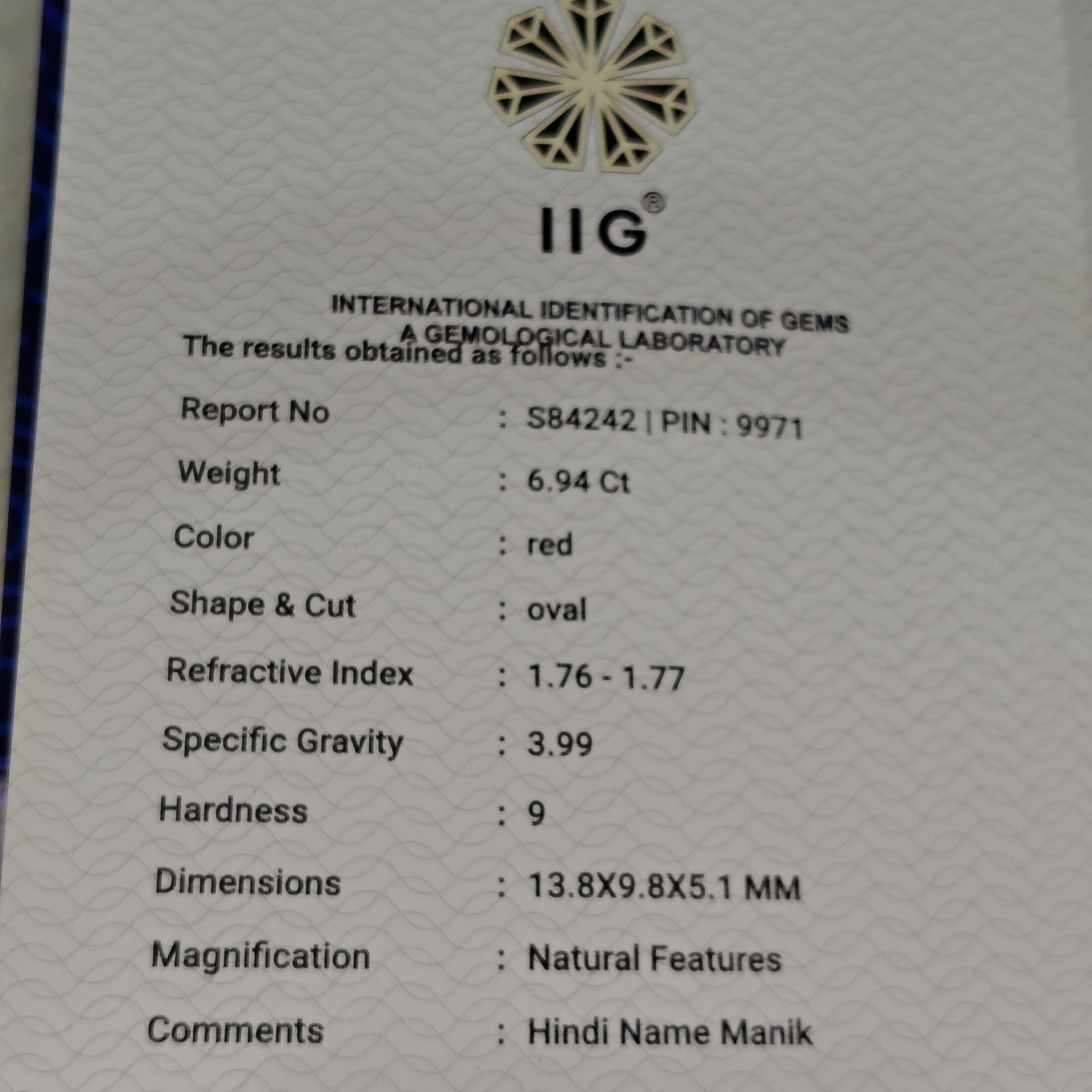 This 6.94 Carat Natural Ruby (Manik) from Bangkok origin is a premium gemstone known for its rich red color and strong astrological significance. Ruby is associated with the planet Sun and is believed to bring confidence, leadership, success, authority, and positive energy to the wearer.